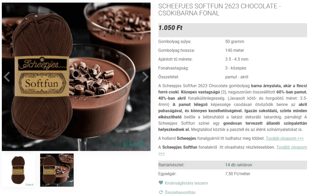 Viszont vidéken kevés a fonalbolt, főleg ekkora kínálattal, amit egy webáruház nyújthat, éppen ezért vásárolnak mégis az emberek az interneten eszközöket, a hobbijukhoz. Én készítettem az egész Shoprenteres webáruházamat, a fotóknál használtam a gyártó által adott fotókat, viszont voltak olyanok, amikkel nem voltam megelégedve a minőségével, vagy nem találtam a fonalakat színazonosnak. Ott magam fotóztam újra, hogy minél jobban be tudjam mutatni, az adott terméket; nagyobb felbontásban, vagy minél közelebbről.