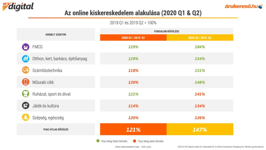 Talán nem is meglepő, hogy a leglátványosabb bővülést az online FMCG (Fast-Moving Consumer Goods), azaz a gyorsan forgó fogyasztási cikkek szektora érte el, +84%-os növekedéssel az előző év azonos időszakához mérten.