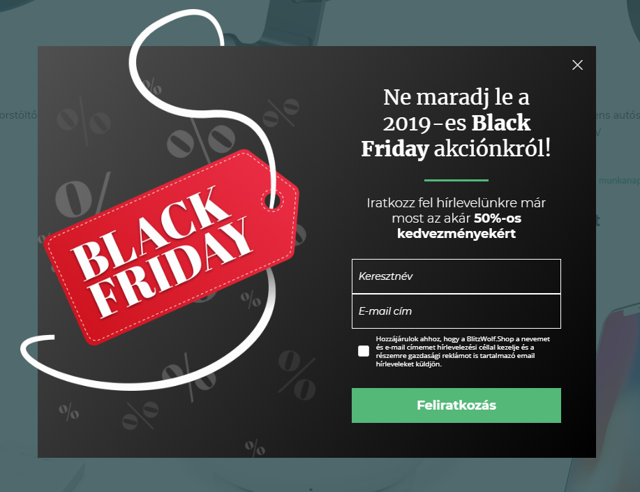 A Blitzwolf.shop webáruház a Black Friday előtt időszakot használta arra, hogy email listát építsen. Aki feliratkozott a hírlevelükre, időben értesülhetett az akár 50%-os kedvezményekről.