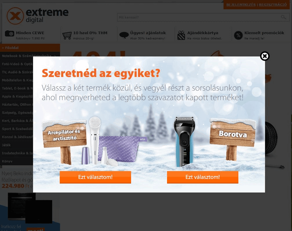 Nagyon jó példa erre az eDigital popupja, melyen egy nyereményjátékra iratkoztatják fel látogatóikat karácsony előtt. Az első oldalon választás elé állították a látogatókat, így nemükre is fény derült, és innentől kezdve lehetővé vált, hogy a karácsonyi hírlevelekben külön kommunikáljanak nőknek és férfiaknak egyaránt.