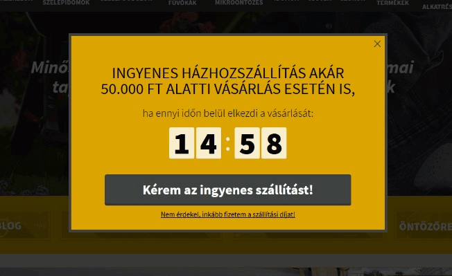 És végül, ne felejts el nagy fókuszt tenni a kosárelhagyókra! Az alábbi popup például a kosárelhagyó látogatókat sürgeti a vásárlás befejezésére.